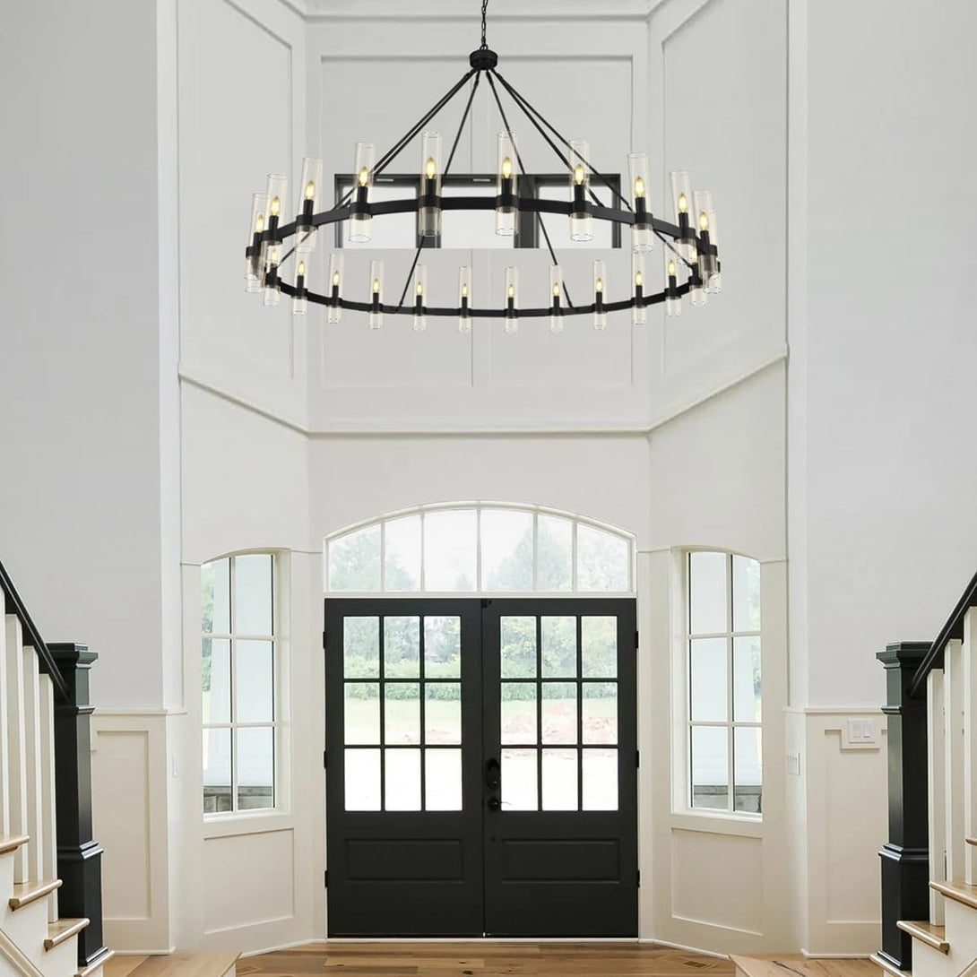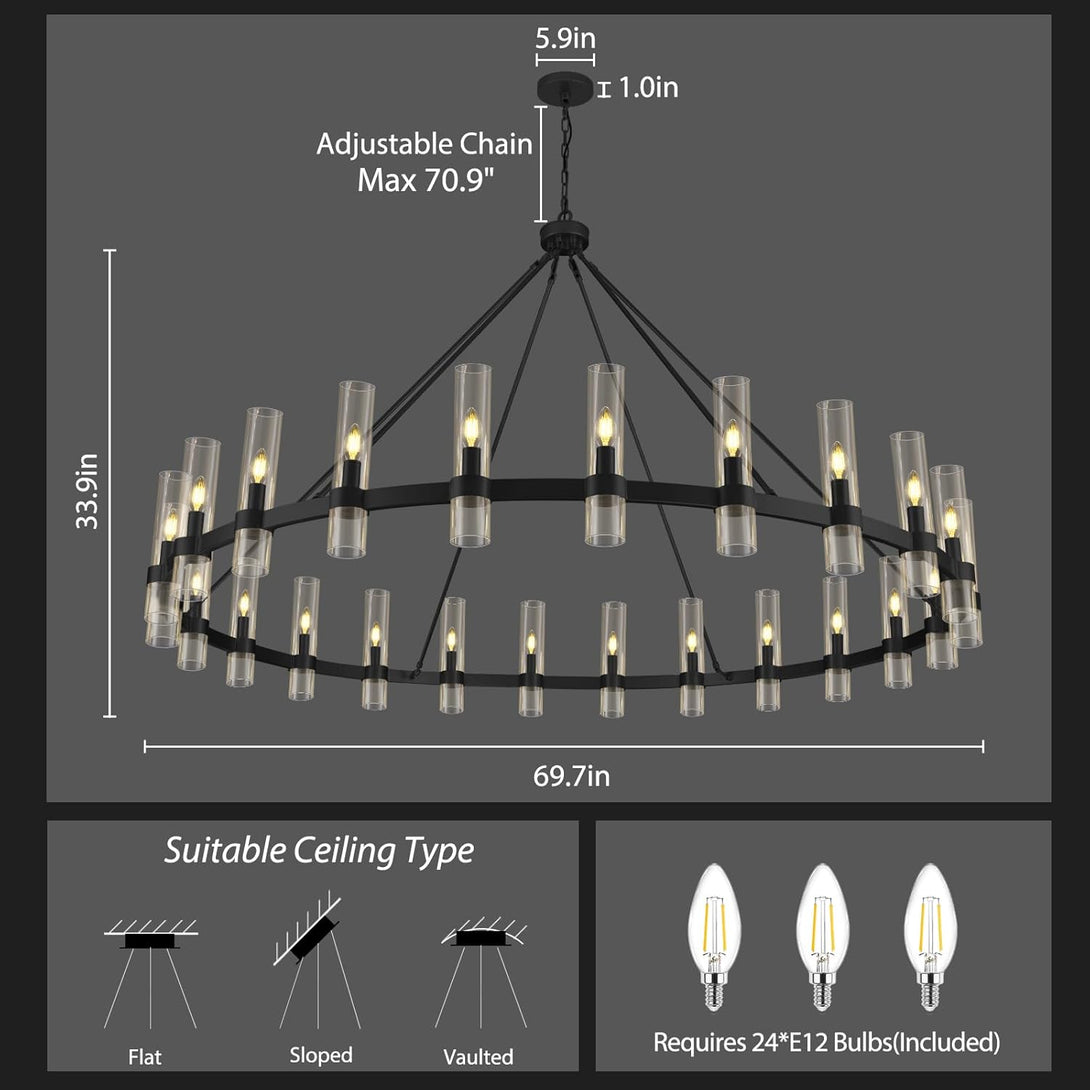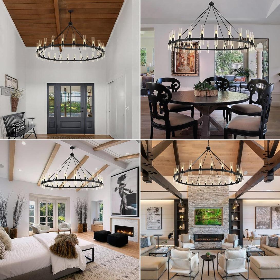 - [Farmhouse Wagon Wheel Chandeliers] 70 inch rustic chandelier features a classic wagon wheel design, the round iron frame complements the clear glass lampshades, exuding an elegant and vintage feeling. No matter your interior decor style is modern, vintage, farmhouse, or rustic, this bedroom chandelier will be an excellent addition!