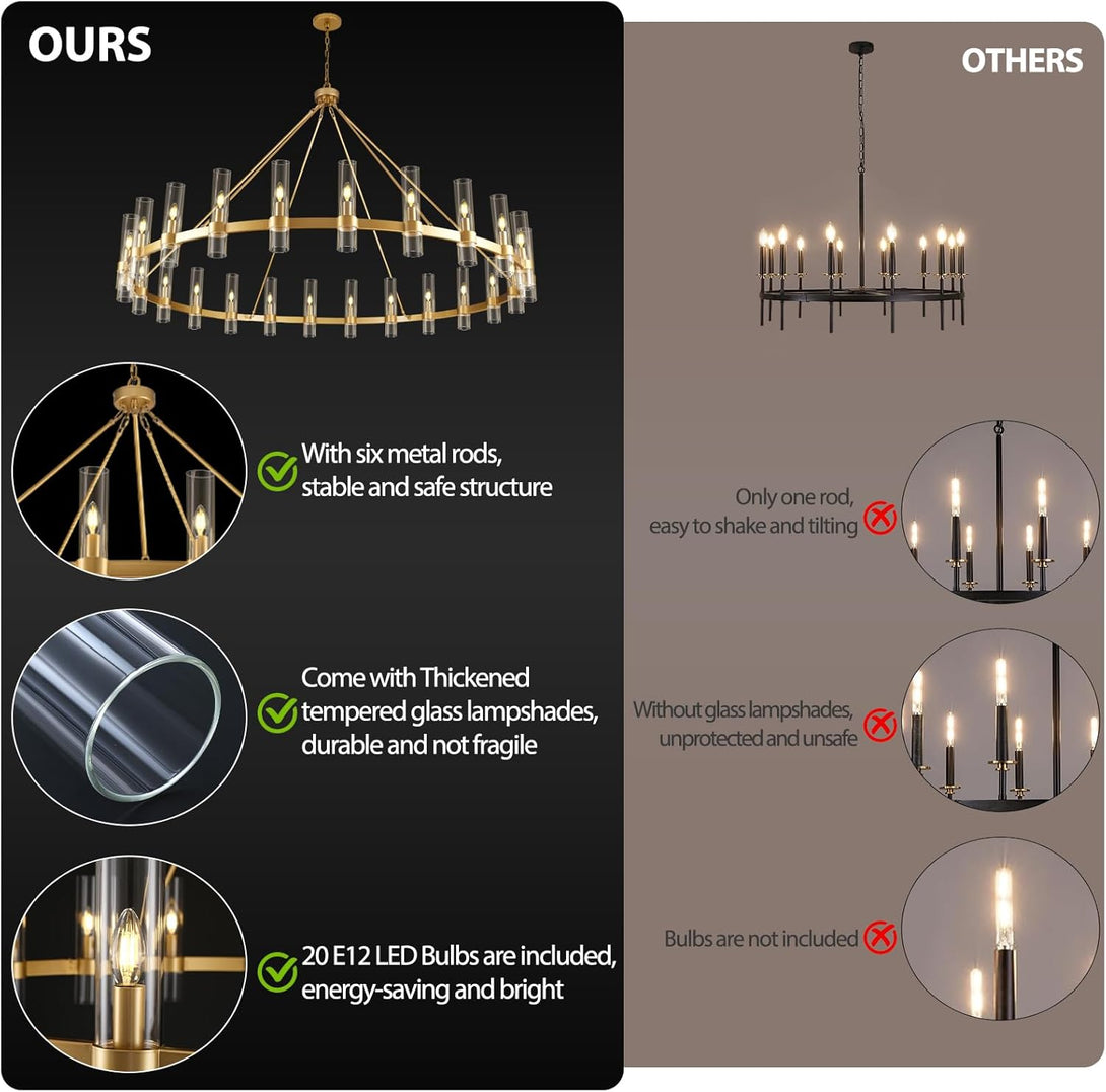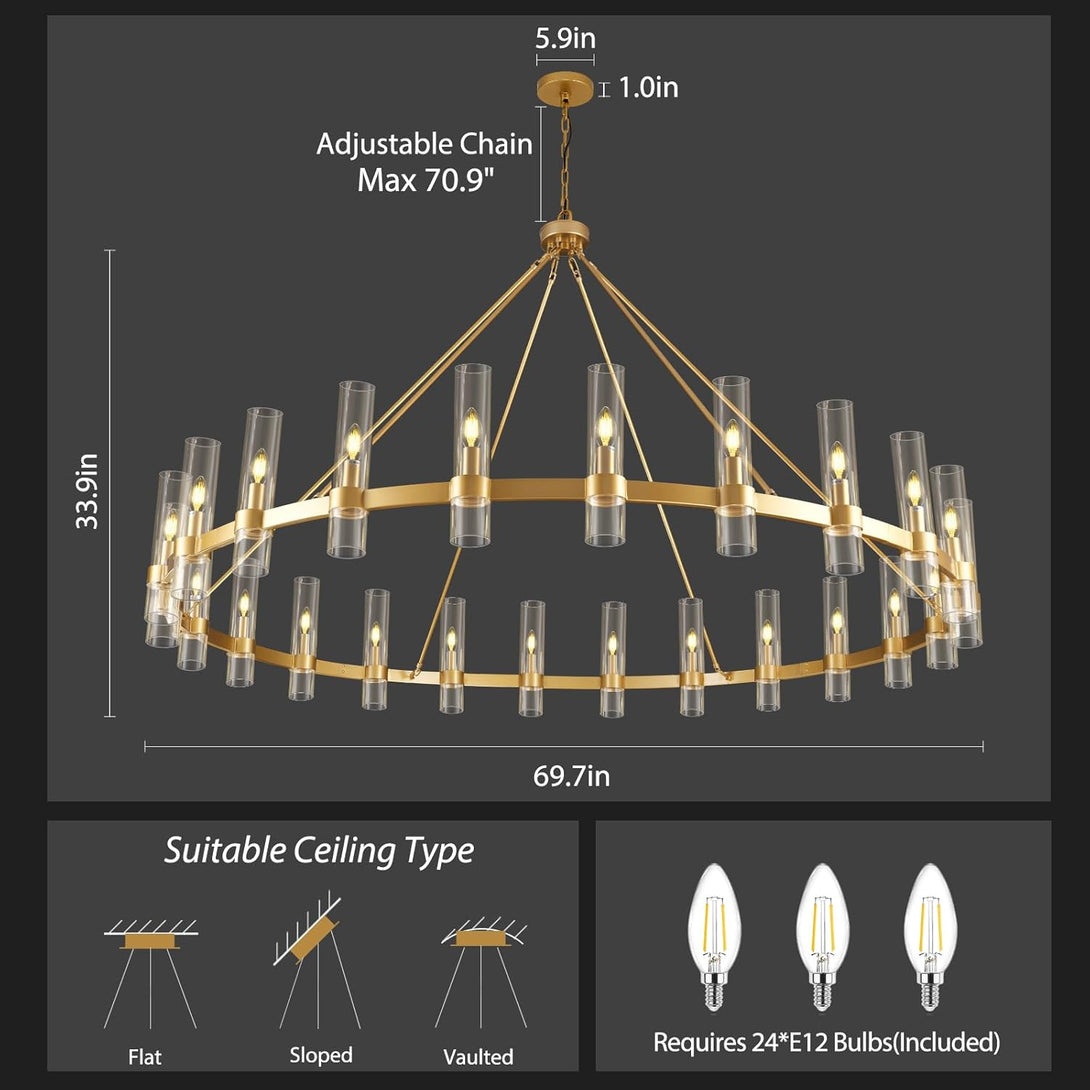 - [24-Light Chandelier Includes Bulbs] The round chandeliers for dining room provide sufficient lighting with 360° light coverage. It comes with 24 LED bulbs, which is energy-saving. It is stepless dimmable from 0% to 100% with a dimmer switch (not included).