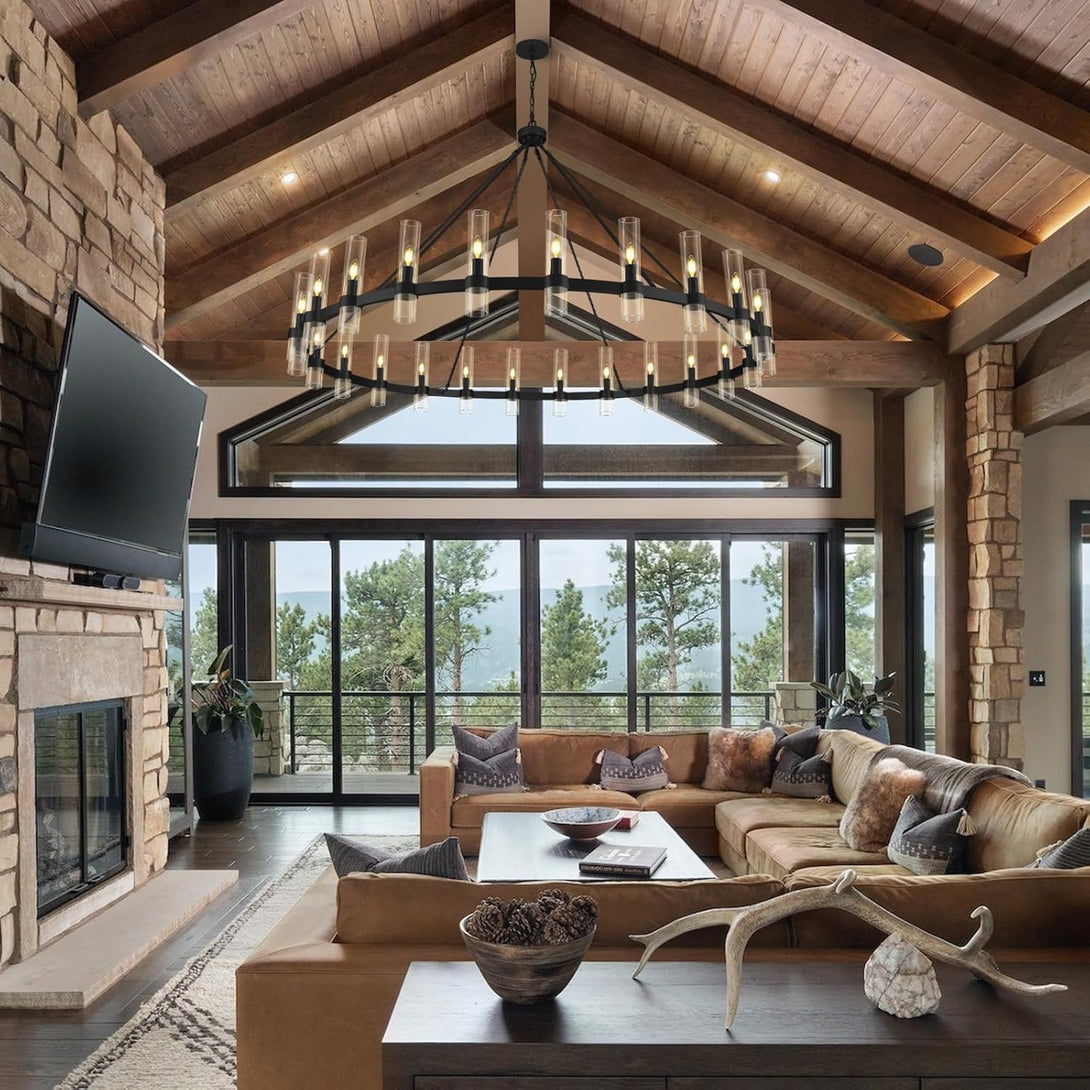 [Multifunctional] This large wagon wheel chandelier measures 69.7"(W)*69.7"(D)*33.9"(H), the large size makes it suitable for various room types, such as living room, dining room, entryway and bedroom. It is height adjustable, the adjustable chain can reach up to 71 inches. It is suitable for flat, sloped or vaulted ceilings.