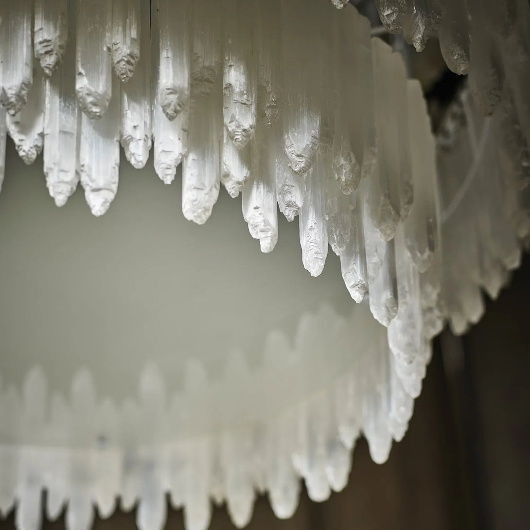 Named after the Greek goddess of the moon, selenite emits a soft, moonlight-like glow. This crystalline form of gypsum is valued for its spiritual and protective properties and is believed to unlock divine wisdom. Our Art Selenite Lighting has crystals carefully set into the frame to resemble glistening stalactites.
