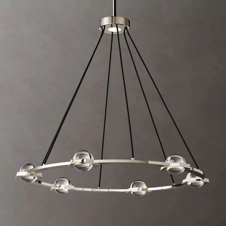 | The collection features lighted crystal orbs, suspended in hexagonal fittings within a flat metal frame. The design was inspired by plans for the cenotaph of Sir Isaac Newton drawn by 18th-century architect Etienne Louis Boullée, a visionary ode to physics reinterpreted in a stunning contemporary form. |