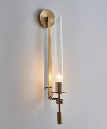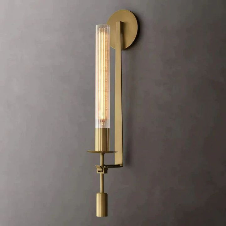 | Made of solid brass, the collection's minimalist construction features Edison bulbs set in cylindrical ribbed glass that shine like candles. |