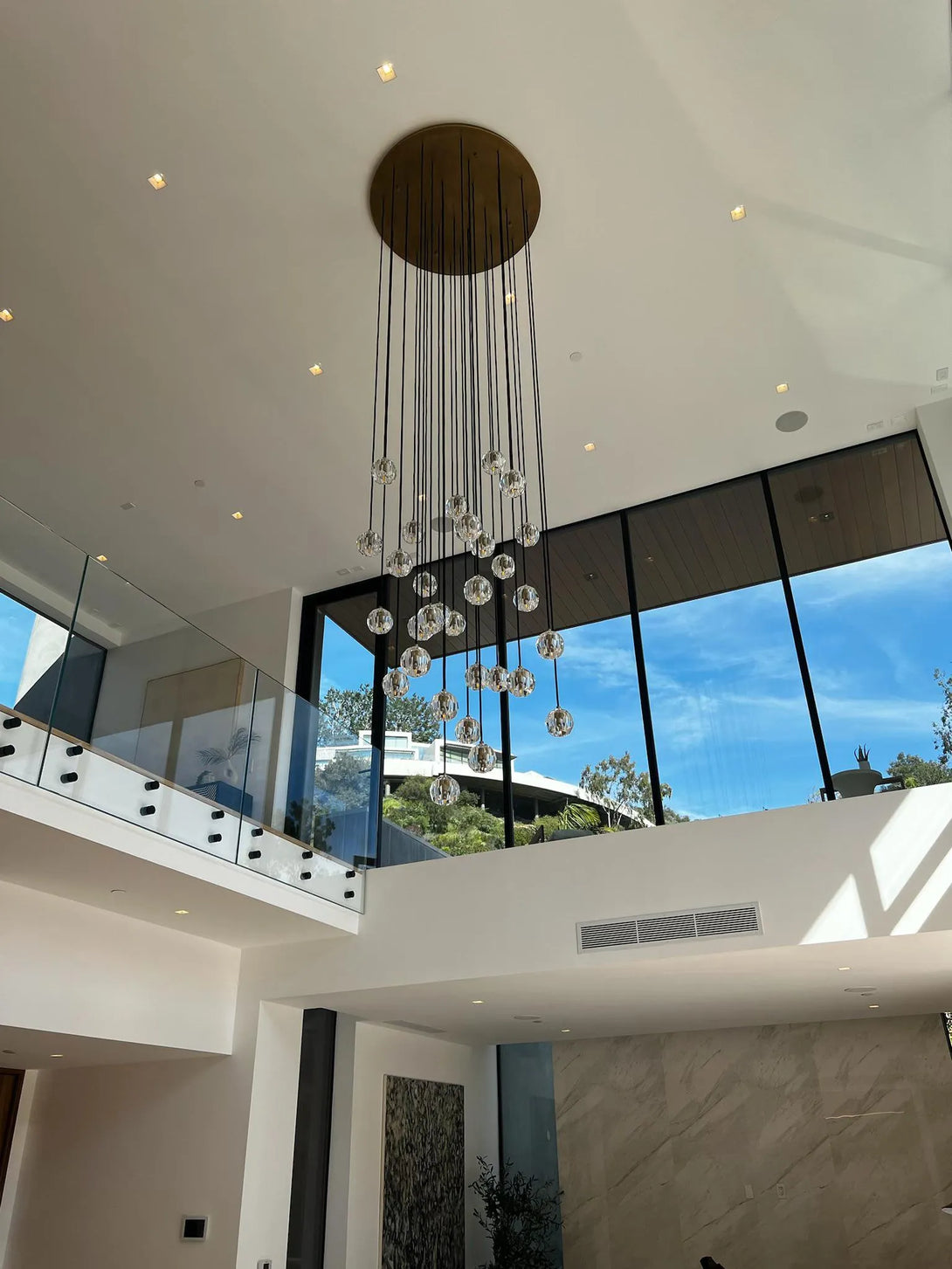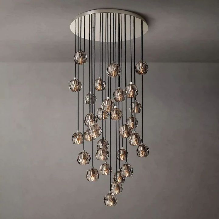 | The collection crafted of solid brass and crystal glass, for luxe materials and superior craftsmanship, each finely faceted sphere is ground and polished by hand to reflect and refract the light. |