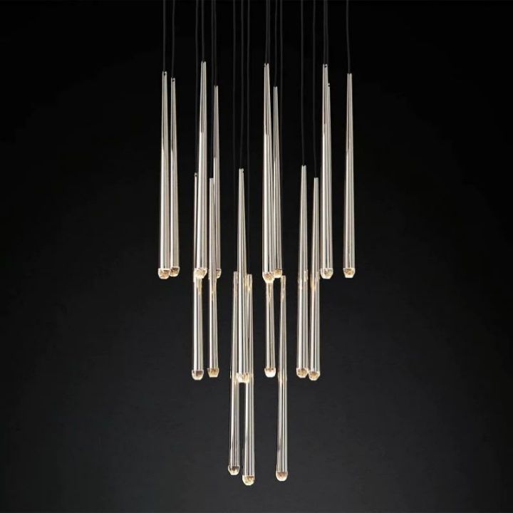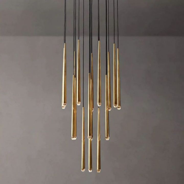 | The main feature of the collection is a cluster of solid brass in the form of a suspension on a thin black cord. Recessed LEDs at the top of the faceted glass provide a warm light. |