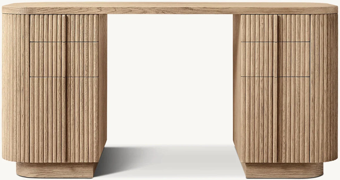 Defined by individually applied reeds of wire-brushed solid American oak. The collection features radius corners that curve around the side for an uninterrupted, fluid silhouette.