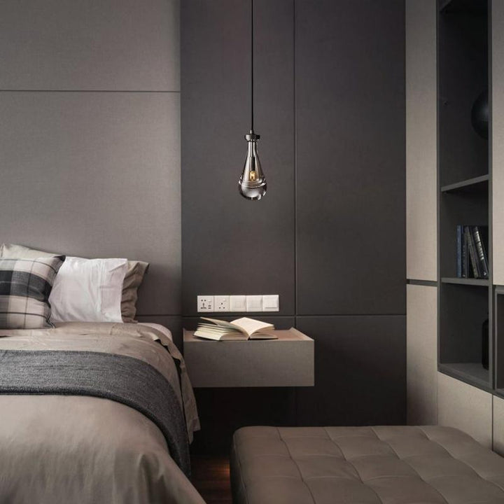 | Much like the rhythm of a rainstorm itself. Suspended from slim black cords, drops of blown glass encase the bulbs – creating the illusion of underwater illumination – and cast luminous ripples that wash across ceilings and walls. |