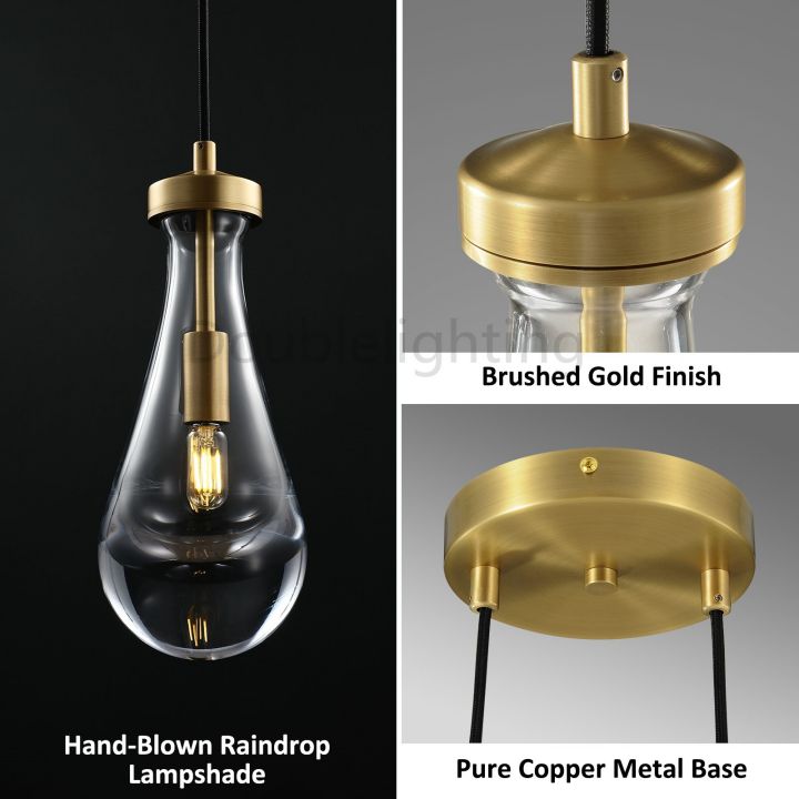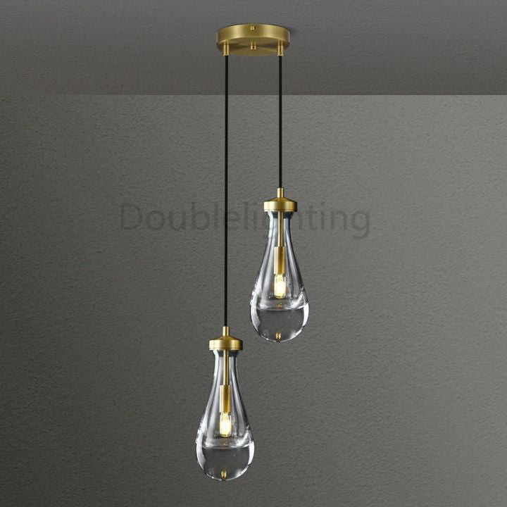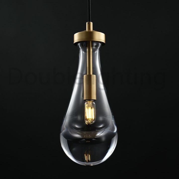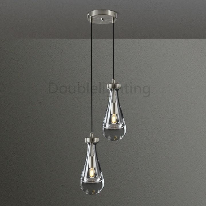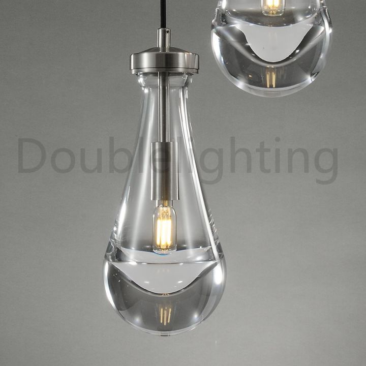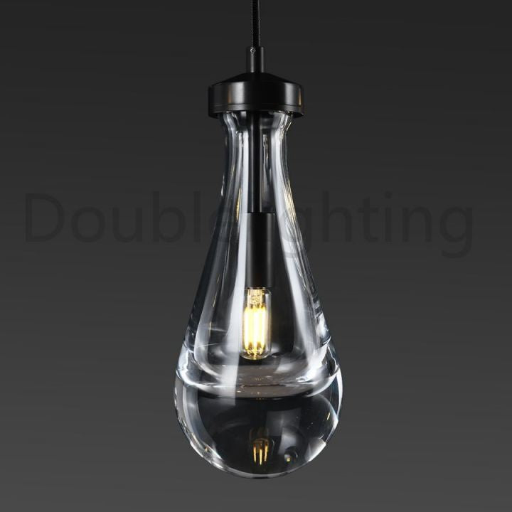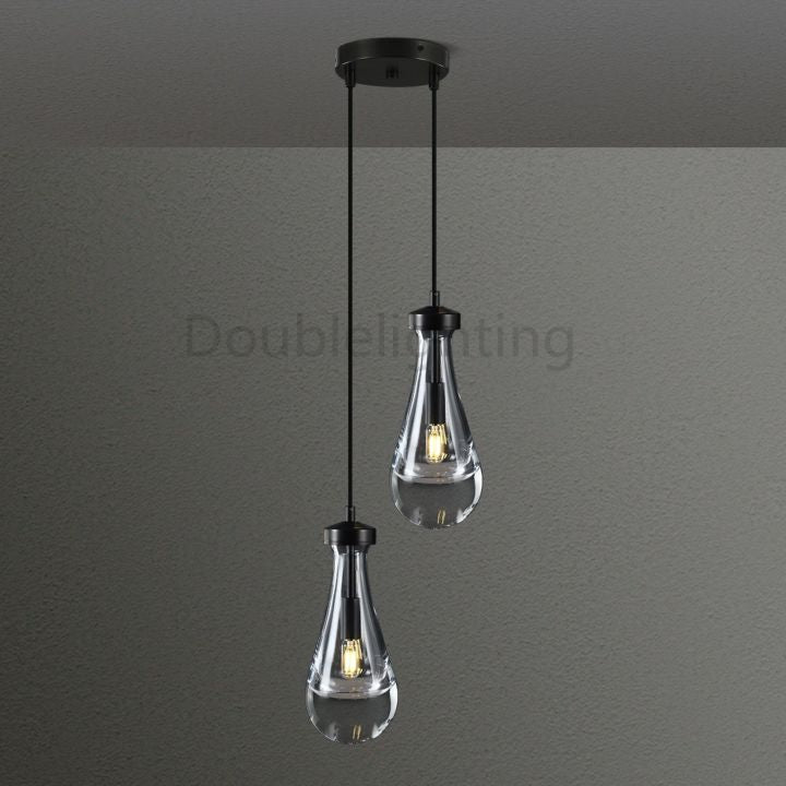 | Much like the rhythm of a rainstorm itself. Suspended from slim black cords, drops of blown glass encase the bulbs – creating the illusion of underwater illumination – and cast luminous ripples that wash across ceilings and walls. |