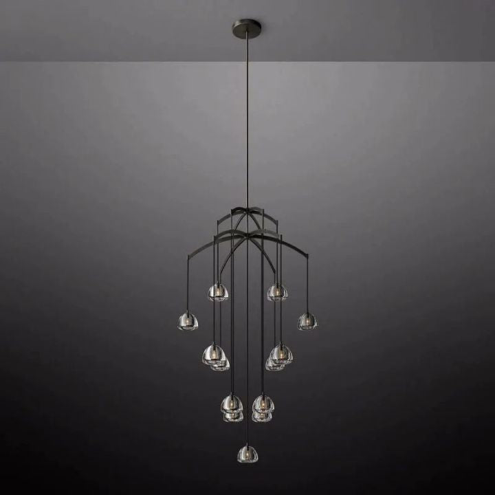 | Evoking the 12th-century structure's flying buttresses, the fixture's winged armature holds aloft hemispheres of cross-cut glass. Lathe-carved from solid blocks of crystal and then hand polished, the thick, heavy domes play counterpoint to the solid brass frame's delicate arc – a vision at once fixed and fluid, strong and fragile. Viewed as an object in space, the silhouette creates a canopy of light overhead. |