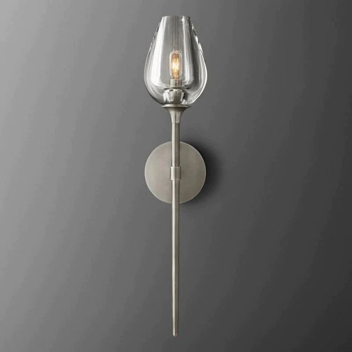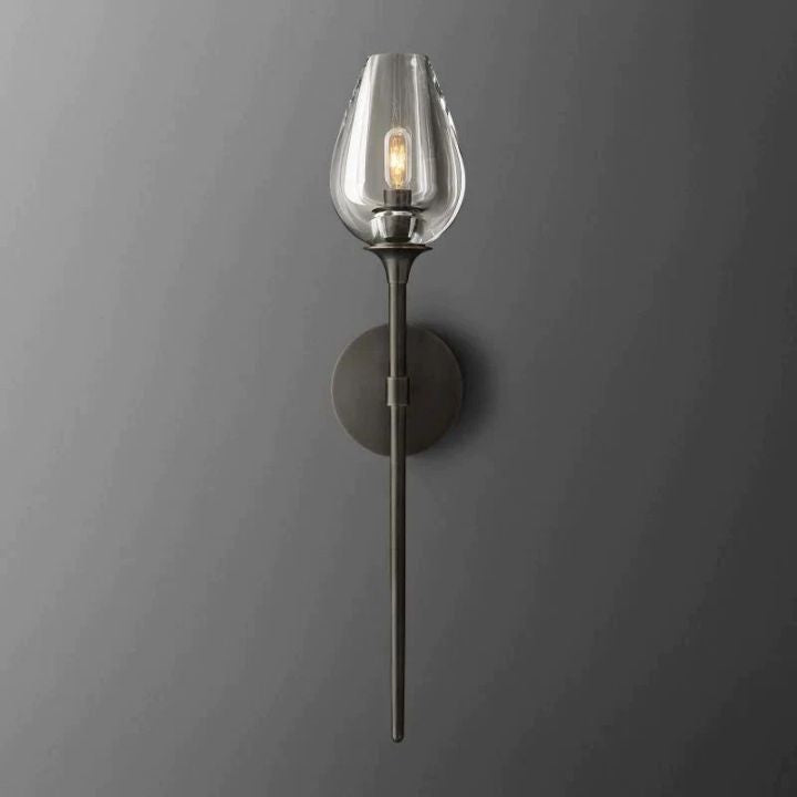 | The form of a tulip in bloom inspired this collection. Lathe-carved from solid blocks of crystal and then hand polished, the glass torchieres' graduated thickness captures a petal's delicate contours while casting a warm, atmospheric glow. An understated brass armature secures the fluid forms, evoking stems fixing the ephemeral flowers in space. |
