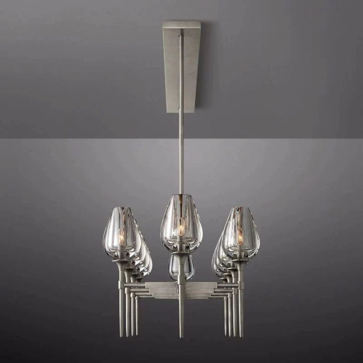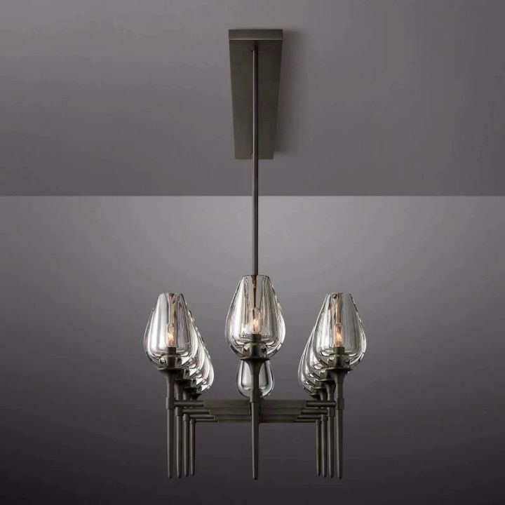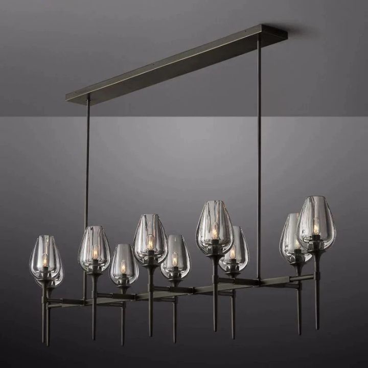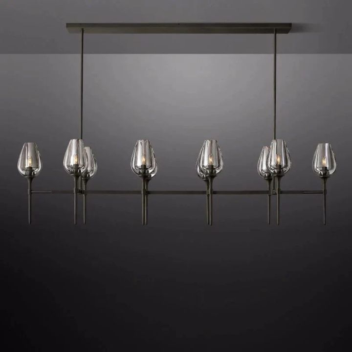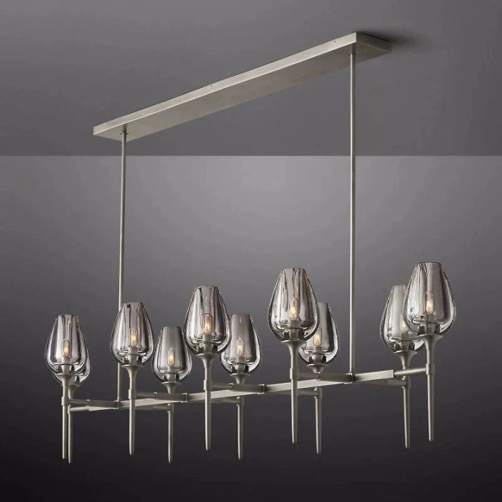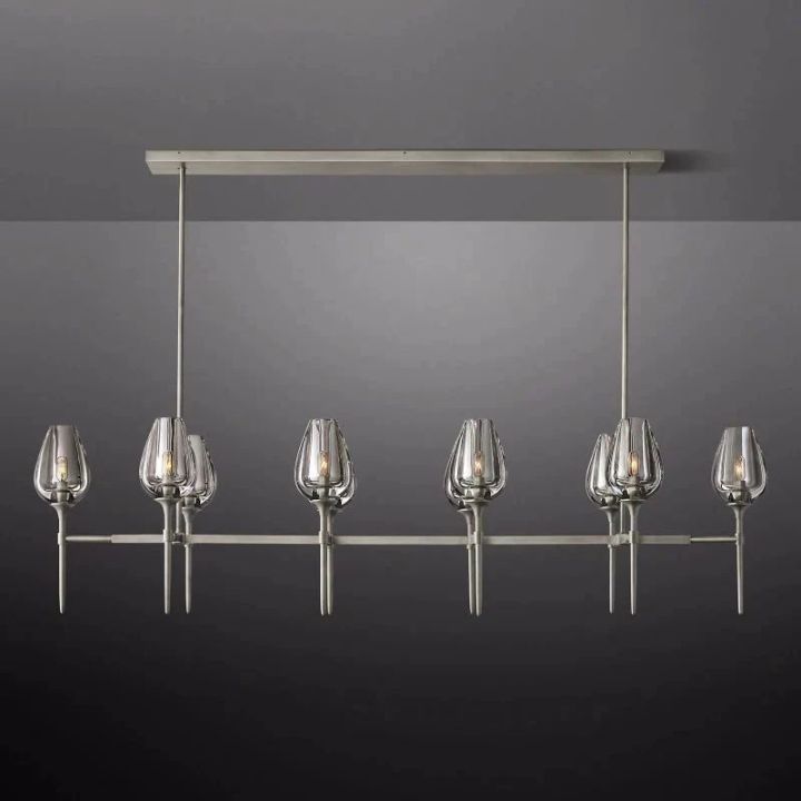 | The form of a tulip in bloom inspired this collection. Lathe-carved from solid blocks of crystal and then hand polished, the glass torchieres' graduated thickness captures a petal's delicate contours while casting a warm, atmospheric glow. An understated brass armature secures the fluid forms, evoking stems fixing the ephemeral flowers in space. |