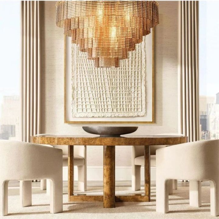 | The collection's chandeliers combine traditional glassmaking techniques with modernist style. It is a study in geometric repetition, with textured ribbons of cast glass cascading in concentric circles, casting a warm glow to stunning effect. |