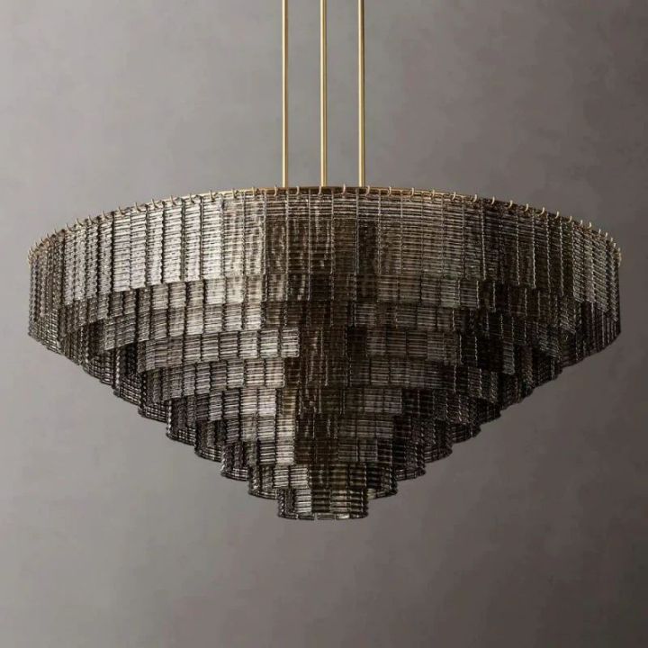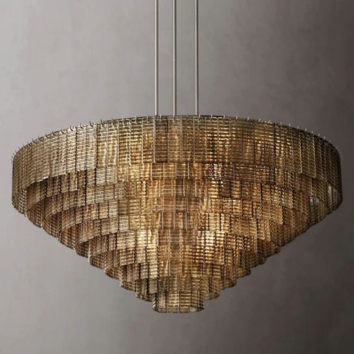 | The collection's chandeliers combine traditional glassmaking techniques with modernist style. It is a study in geometric repetition, with textured ribbons of cast glass cascading in concentric circles, casting a warm glow to stunning effect. |
